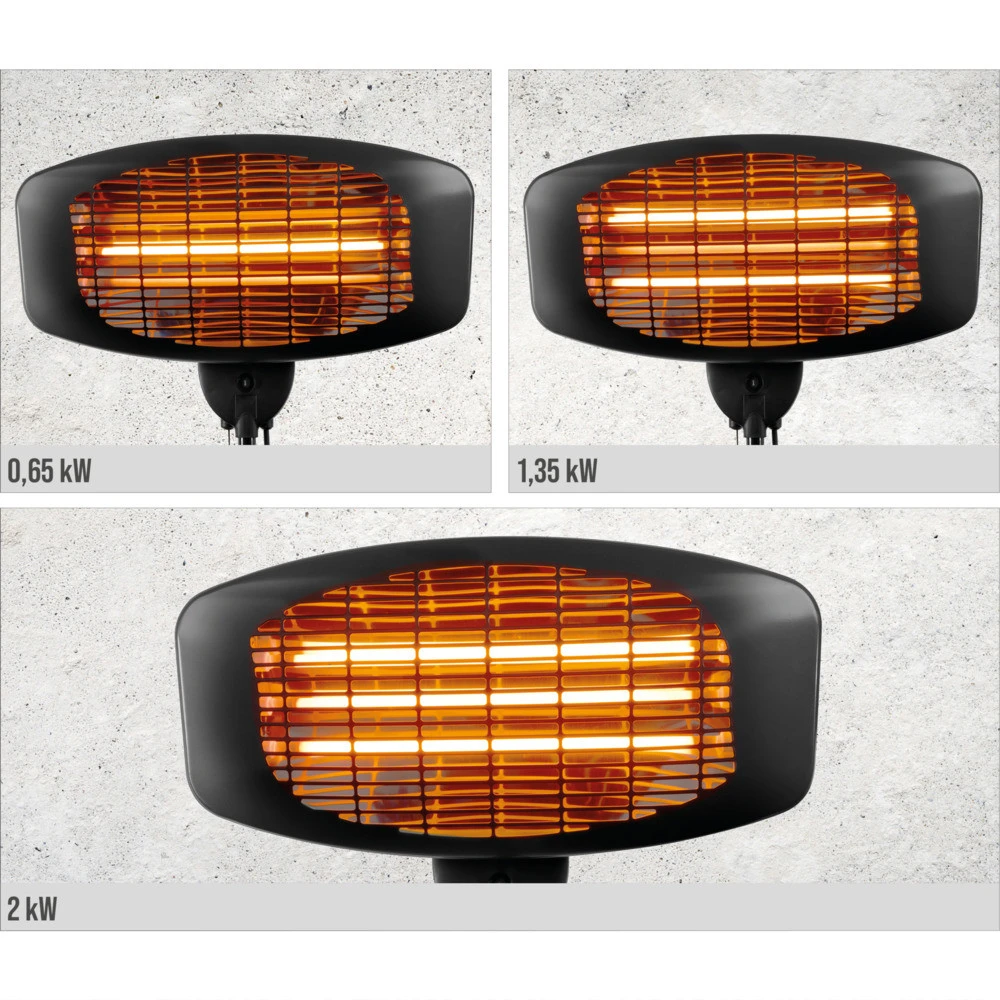 Der elektrische Stand-Heizstrahler GIH 2000 von Güde mit Teleskopstange und verstellbaren Neigungswinkel eignet sich für den Innen- und Außenbereich. Seine Quarz-Heizelemente sorgen für eine schnelle Wärmeentwicklung die sich in drei Heizstufen (650/1350/2000 Watt) regulieren lässt.Somit ist der Heizstrahler ideal für Wohnräume für bis zu ca. 15 m². Sollte der Standheizer einmal versehentlich umgestoßen werden, schaltet der Kippschutz das Gerät automatisch ab. Sein stabiles Metallgestell macht ihn besonders widerstandsfähig. Ein ca. 2,60 m langes Netzkabel ist im Lieferumfang enthalten.