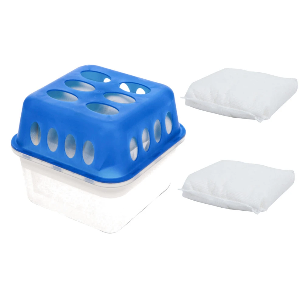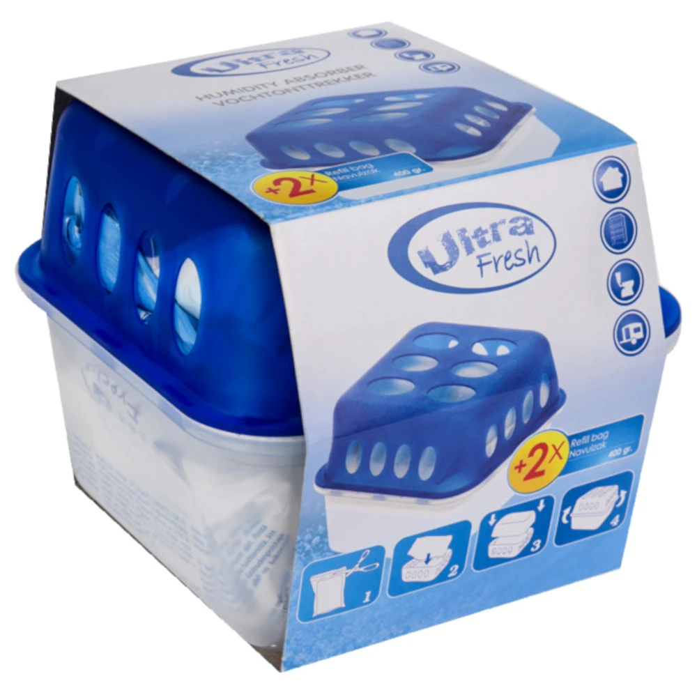 Luftentfeuchter aus Kunststoff in weiß mit blauem Deckel und 2 Granulat-Nachfüllkissen