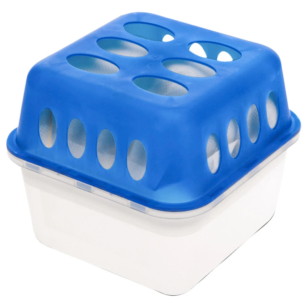 Diese Luftentfeuchterbox aus robustem Kunststoff in Weiß mit blauem Deckel und die beiden mitgelieferten Granulat-Kissen verhindern die Bildung von Kondenswasser, Schimmel und muffigen Gerüchen in weniger belüfteten Räumen wie z.B. Kellern oder Autos. Durch den Raumentfeuchter wird überschüssige Luftfeuchtigkeit der Luft entzogen, bis ein gesundes Raumklima erreicht ist. Dadurch lösen sich die Granulat-Kristalle im Kissen langsam auf. Somit entsteht eine salzige Flüssigkeit, welche sich in der Auffangschale des Entfeuchters sammelt und leicht entleert werden kann.