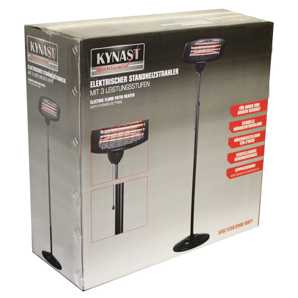 Der elektrische Stand-Heizstrahler mit Teleskopstange und verstellbaren Neigungswinkel ist ein praktischer Helfer für innen und außen. Seine Quarz-Heizelemente sorgen für eine schnelle Wärmeentwicklung die sich in drei Heizstufen regulieren lässt. Die Wirkfläche des Strahlers beträgt ca. 15 m². Sollte der Standheizer einmal versehentlich umgestoßen werden, schaltet der Kippschutz das Gerät automatisch ab. Sein Stabiler Metallrahmen macht ihn besonders Widerstandsfähig.